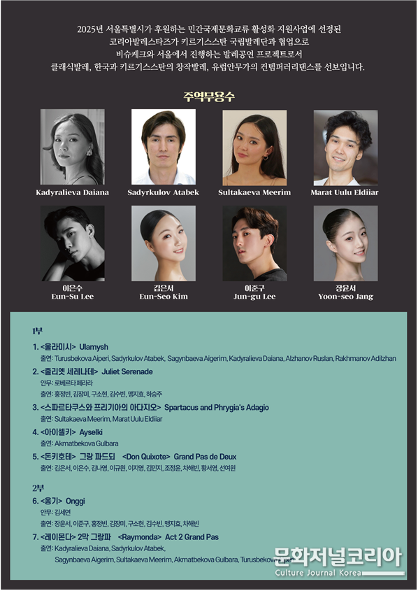 문화저널코리아 오형석 기자 | 서울특별시가 후원하고 코리아발레스타즈(단장 조미송)가 주최하는 '서울과 비슈케크의 Ballet 향연'이 오는 10월 18일(토) 오후 5시, 금천구 금나래아트홀에서 열린다. 이번 공연은 코리아발레스타즈가 '2025 서울특별시 민간국제문화교류 활성화 지원사업'에 선정되며 추진하는 국제협력 프로젝트로, 한국과 키르기스스탄의 대표 발레단이 함께 무대에 오르는 직관시리즈의 완성 무대다.