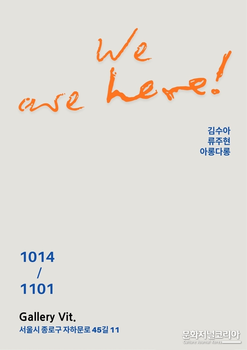문화저널코리아 오형석 기자 |서울 종로구 자하문로 45길 11에 위치한 갤러리 비트(Gallery Vit.)에서는 오는 10월 14일부터 11월 1일까지, 세 명의 젊은 작가 김수아, 류주현, 아롱다롱이 참여하는 그룹전 'We are here!'가 열린다.