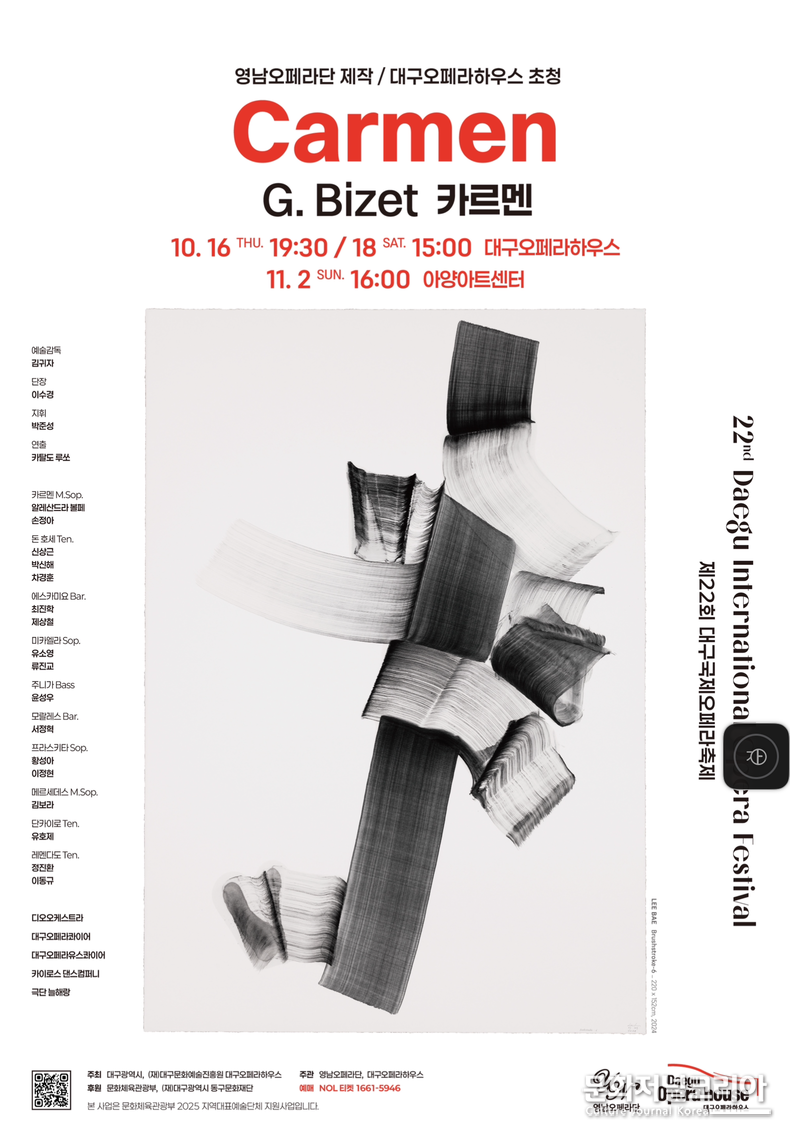 문화저널코리아 오형석 기자 |(재)대구문화예술진흥원 대구오페라하우스는 문화체육관광부 '2025 지역대표예술단체 육성지원사업' 선정된 영남오페라단의 오페라 '카르멘'을 제22회 대구국제오페라축제의 메인 프로그램으로 초청하여 오는 10월 16일(목), 18일(토), 11월 2일(일)에 개최한다.