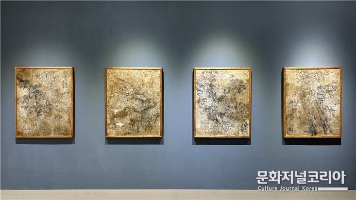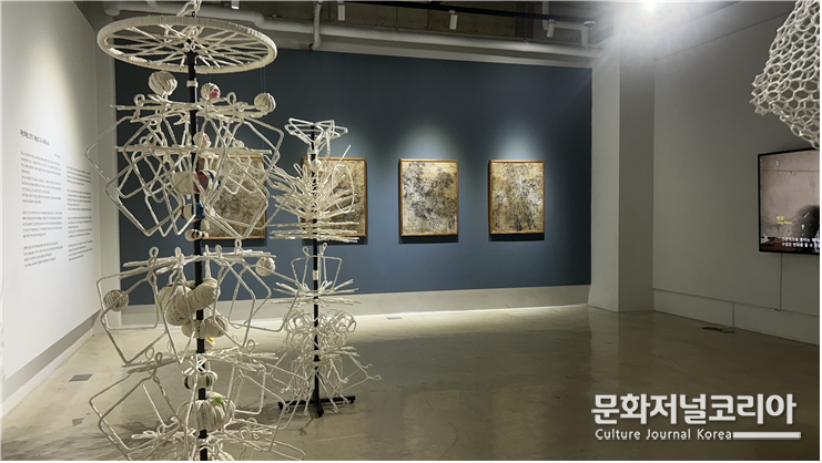정진용 작가는 인공지능 시대의 예술 주체성과 인간 감각의 지속성을 한지에 투영한다. 그의 화면에서 한지는 '빛과 어둠, 기억과 소멸'이 교차하는 존재의 피부처럼 드러난다. 김병철은 한지를 언어적 기념비로 확장하며, 오랜 시간의 흔적과 손의 감각이 결합된 조형물로 '기억의 시간성'을 형상화한다.