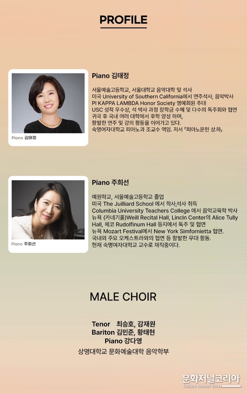 이번 무대의 중심에는 두 명의 피아니스트, 김태정과 주희선이 선다. 두 연주자는 클래식의 정통성과 현대적 감성을 동시에 아우르며, 서로 다른 예술적 배경이 만들어내는 조화로움을 선보일 예정이다.