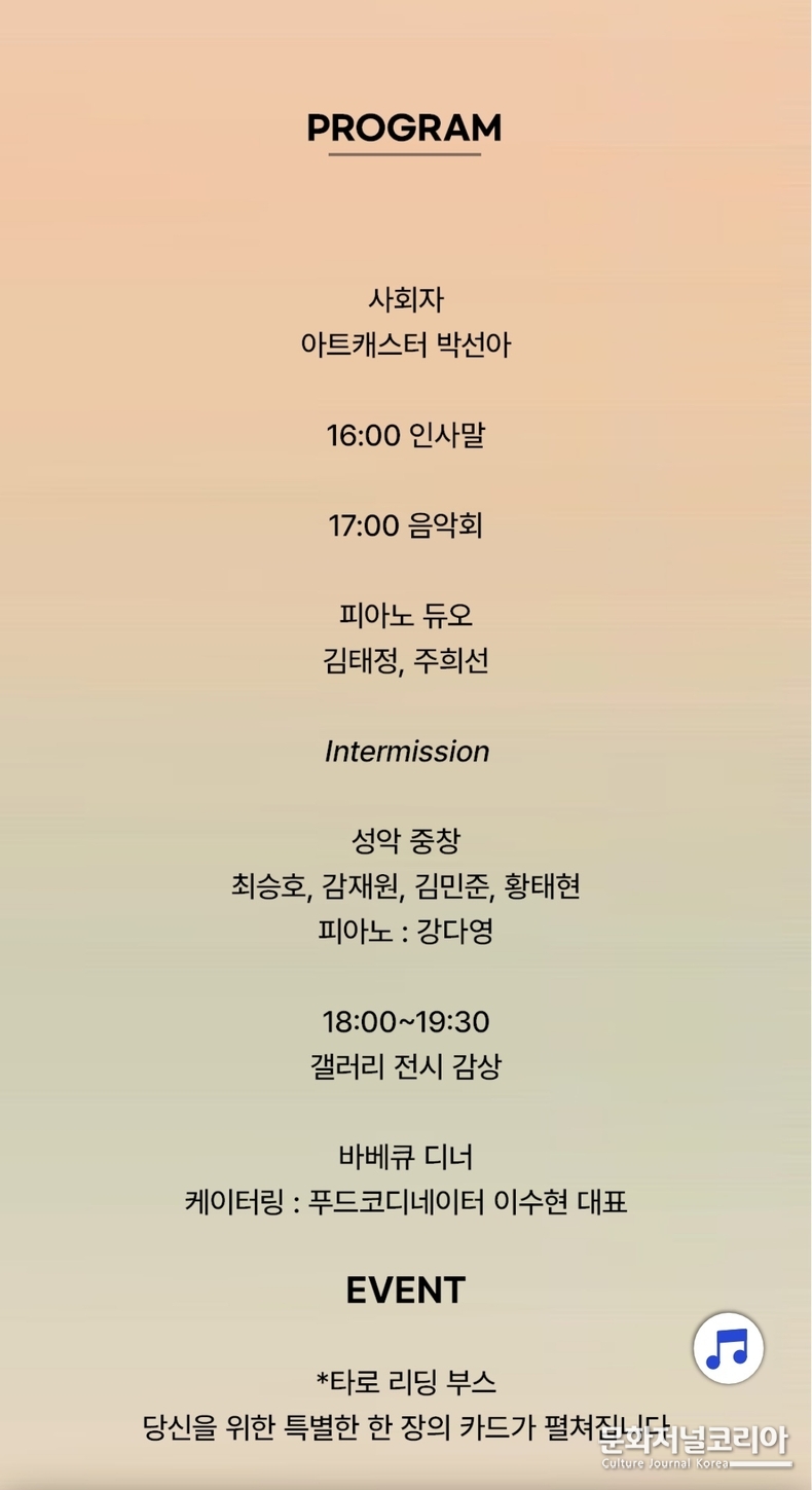 사회는 아나운서출신으로 아트캐스터로 활약중인 박선아가 맡으며, 이목인 대표의 인사말을 시작으로 피아노 듀오 연주, 성악 공연, 그리고 갤러리 전시 감상 및 바비큐 디너가 이어진다. 행사 현장에는 관객 참여형 이벤트 '타로 리딩 부스'도 함께 운영되어, 예술을 통한 감정의 '한 장의 메시지'를 선물처럼 전한다.
