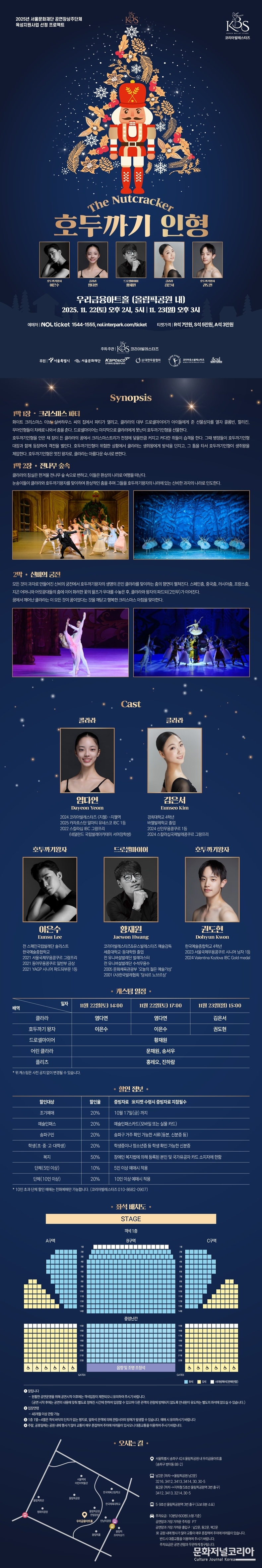 한편 코리아발레스타즈의 '호두까기인형'은 11월 22일 토요일 오후 2시와 5시, 23일 일요일 오후 3시에 공연되며, 공연시간은 인터미션 20분을 포함한 120분이다. 차이콥스키의 아름다운 음악과 함께 펼쳐지는 이번 공연은 온 가족 단위 관객은 물론 발레 팬들에게도 잊지 못할 감동을 선사할 것으로 기대된다. 티켓은 인터파크 티켓(ticket.interpark.com)에서 예매할 수 있으며, 관람료는 R석 7만원, S석 5만원, A석 3만원이다.