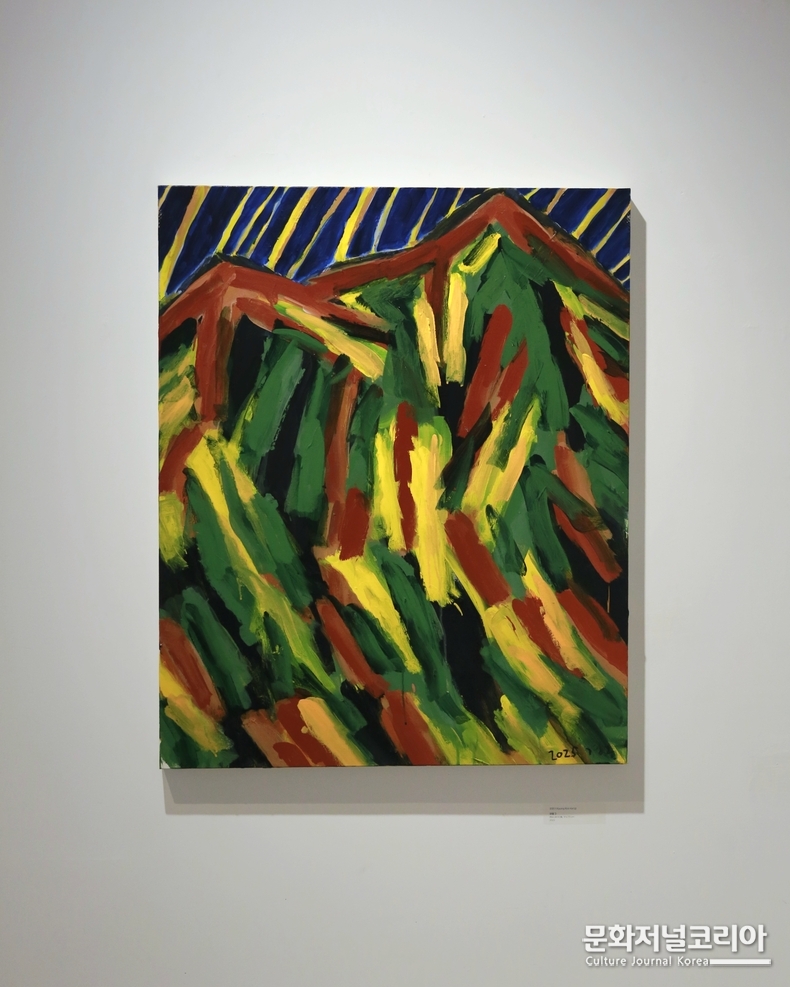 한편, 작품 제작 과정에서 작가가 보여주는 강한 신체성 또한 주목할 지점이다. 붓 대신 손과 팔, 몸의 움직임 전체가 화면에 개입하며, 선과 면은 계산이 아닌 체온의 리듬으로 구축된다. 회화는 자연과 자아 사이에 놓인 중재수단이 아니라, 감각이 곧 형상이 되는 직접적 통로로 기능한다. 산업화된 시각문화가 이미지를 외부로부터 소비해오는 반복 구조를 따른다면, 강경구의 작품은 감각이 내부에서 외부로 밀려나는 역(逆)방향의 운동에 가깝다.