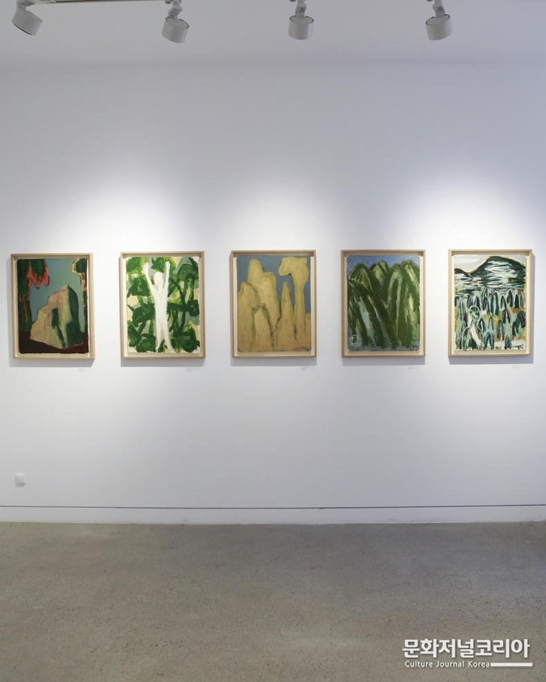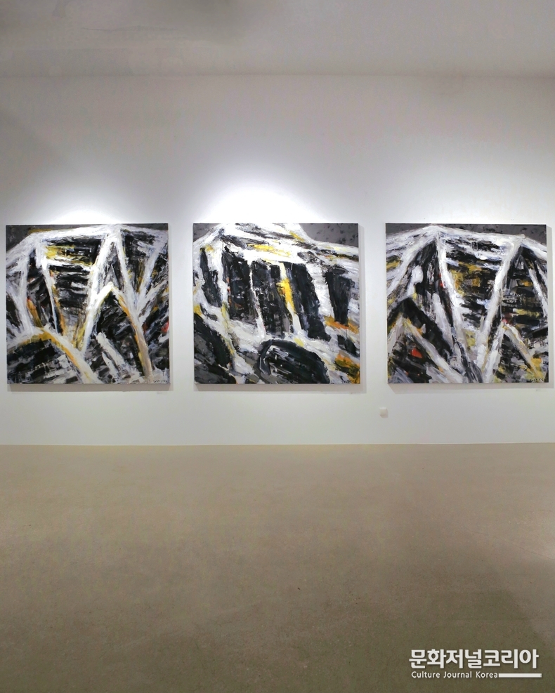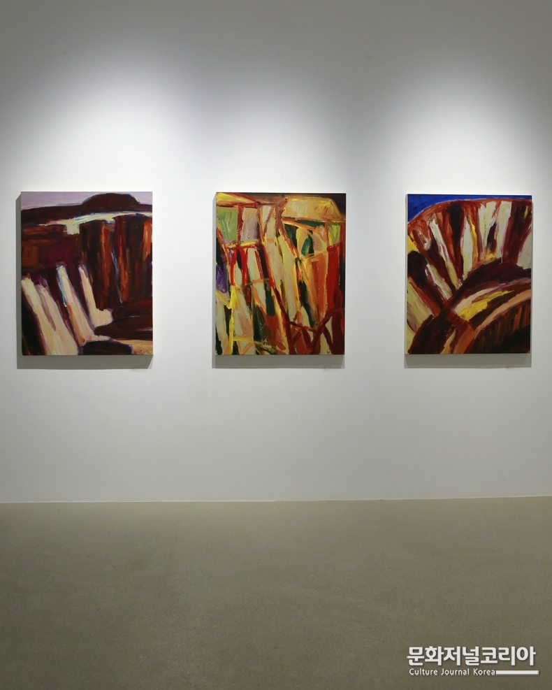 연포마을은 절벽과 강물, 바람과 잔설이 공존하는 독특한 지형적 리듬을 가진 장소로, 강경구는 이곳에서의 체험을 단순한 풍경 감상의 차원이 아니라, 자연과 대면하는 존재의 체험으로 받아들인다. 화면 위에 남겨지는 선과 색은 외부 풍경의 묘사가 아니라, 자연이 작가의 몸에 남긴 흔적이며 감각의 반향이다. 즉, 그림은 ‘보는’ 행위가 아닌 ‘받아들이고 다시 흘려보내는’ 과정으로 완성된다.