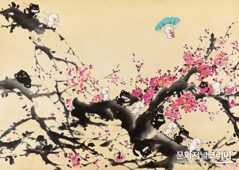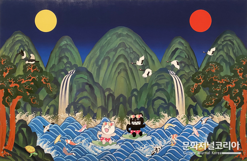 장 보드리야르가 말한 기호의 과잉 사회에서, 낸시랭은 가장 노골적인 욕망의 기표 위에 가장 무력한 생명 이미지를 얹어 놓음으로써 욕망의 방향을 되묻는다. 또 하나의 축은 민화 시리즈다. 오방색과 길상적 상징을 차용한 이 작업은 서구 팝아트의 문법을 단순히 반복하지 않겠다는 작가의 자의식을 드러낸다.