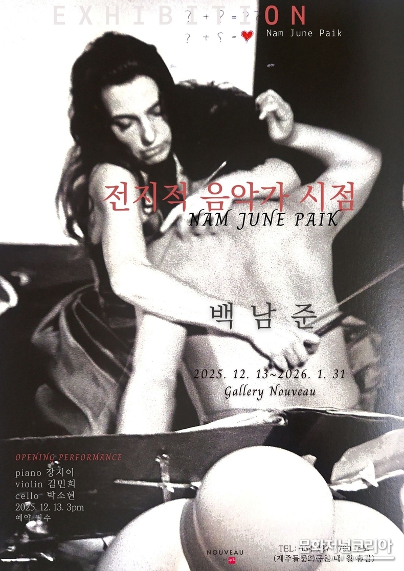 문화저널코리아 오형석 기자 |백남준을 떠올릴 때 가장 먼저 연상되는 것은 텔레비전 모니터와 전자 이미지, 그리고 기술과 예술의 결합이다. 그는 분명 비디오아트의 창시자이며, 20세기 예술의 지형을 근본적으로 바꾼 인물이다. 그러나 이 확고한 이미지 뒤에는 상대적으로 가려져 온 또 하나의 이름이 있다. 바로 '음악가 백남준'이다. 제주돌문화공원 내 갤러리 누보에서 열리고 있는 기획전 '백남준: 전지적 음악가 시점'은 이 오래된 질문을 다시 꺼내 든다. 백남준 예술의 출발점은 과연 어디였는가.
