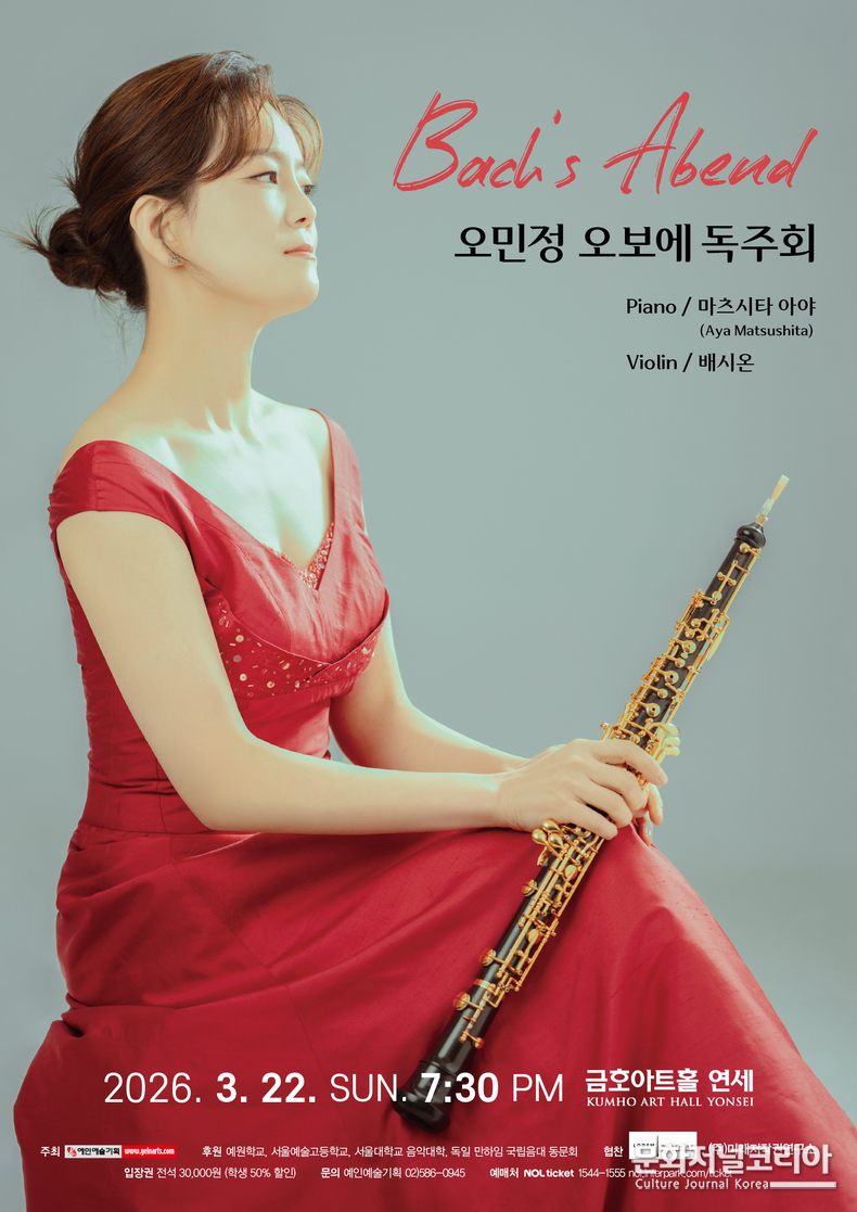문화저널코리아 오형석 기자 |오보이스트 오민정이 오는 3월 22일(일) 오후 7시 30분, 서울 신촌 금호아트홀 연세에서 독주회 'Bach’s Abend'를 연다. 전곡을 Johann Sebastian Bach의 작품으로 구성한 이번 무대는 오보에의 맑고 깊은 음색으로 바로크 음악의 본질을 조명하는 자리다.
