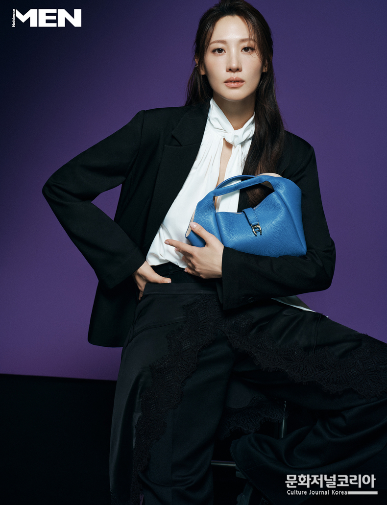특히 눈길을 끄는 것은 컬러 대비다. 화이트 셔츠와 블랙 재킷 룩에 포슬린 블루 백을 더해 선명한 포인트를 주었고, 화이트 트위드 니트 재킷에는 블랙 스퀘어 백을 매치해 천연 소가죽 특유의 자연스러운 광택과 구조적 아름다움을 강조했다. 수현의 깊이 있는 눈빛과 절제된 표정 연기는 의상과 완벽한 조화를 이루며 화보의 완성도를 높였다.