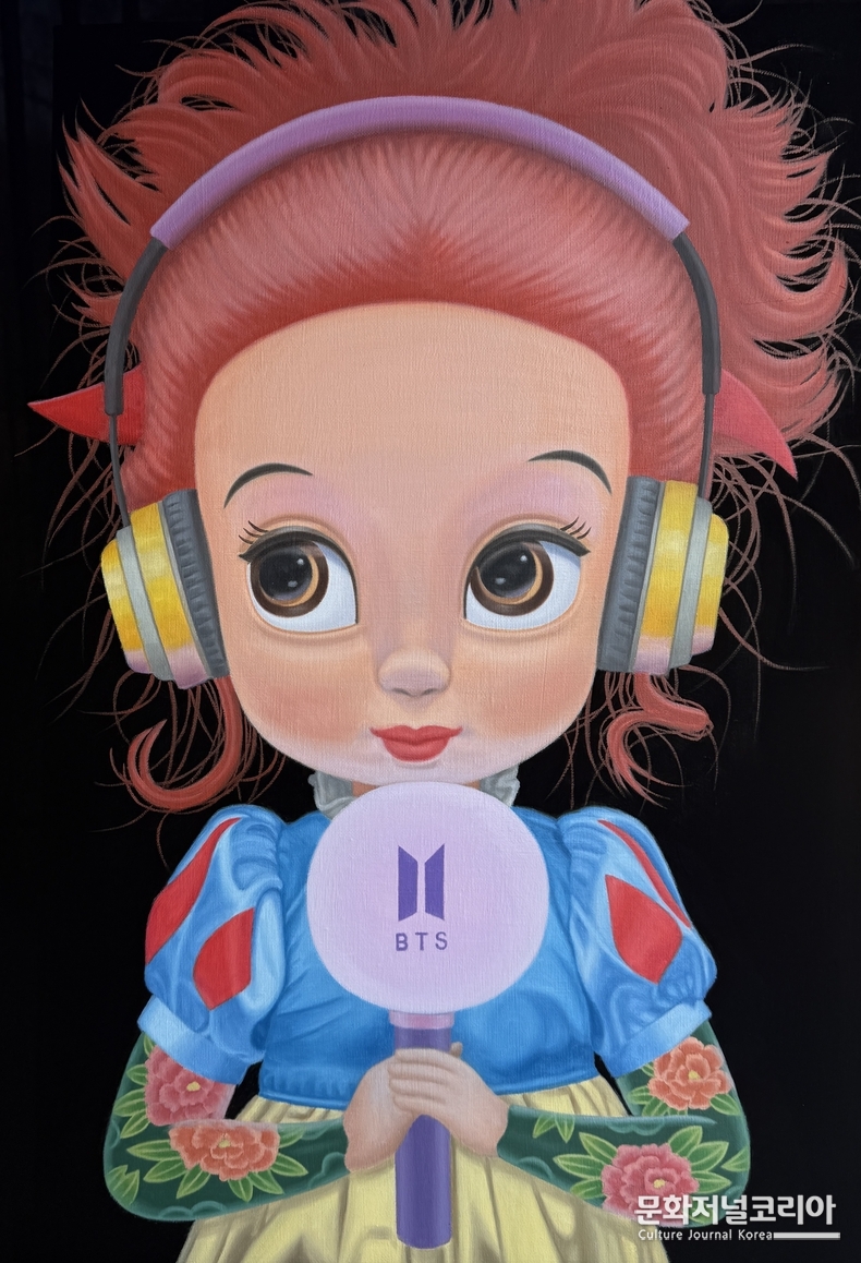 신을 마주하는 주체적 투사는 종교적 상징물에만 국한되지 않는다. 현대의 아이콘인 BTS의 응원봉, ‘아미밤’을 손에 든 백설공주는 열정적으로 사랑하는 대상을 향해 기꺼이 추종자가 되기를 자처하는 이 시대 젊은이들의 초상이다. 오늘날의 아이돌은 거대 종교가 삶의 해답을 주지 못하는 시대에 각자의 일상을 버티게 하는 안식처이자, 삶의 방향을 설정해 주는 실존적 나침반이 되었음을 시사한다.