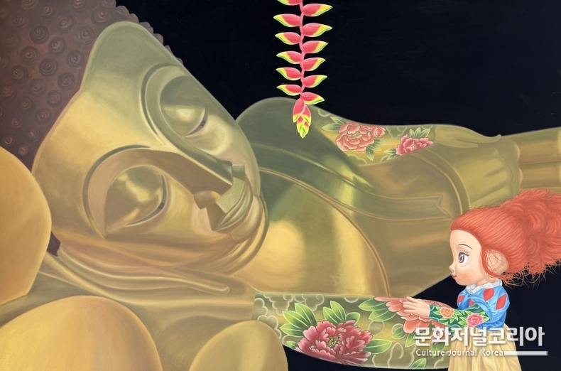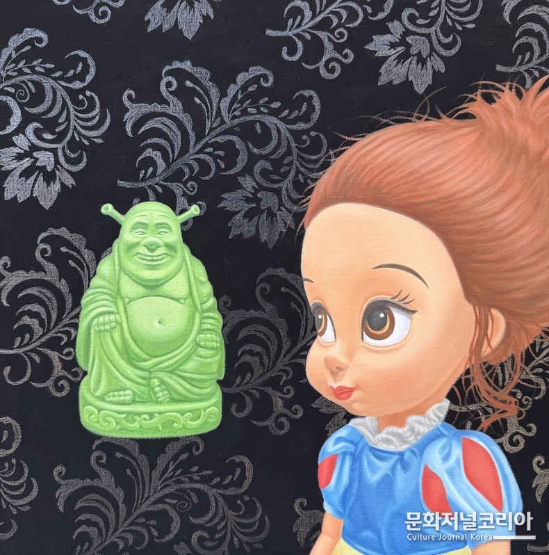 작가는 붓다와 마주 선 백설공주를 담은 작품 〈일체유심조〉를 통해, 신성이란 외부의 맹목적 믿음이 아니라 주체의 의지가 발현되는 순간 비로소 형태를 갖추는 것임을 역설한다. 이번 주제의 단초가 된 실제 사례도 흥미롭다.