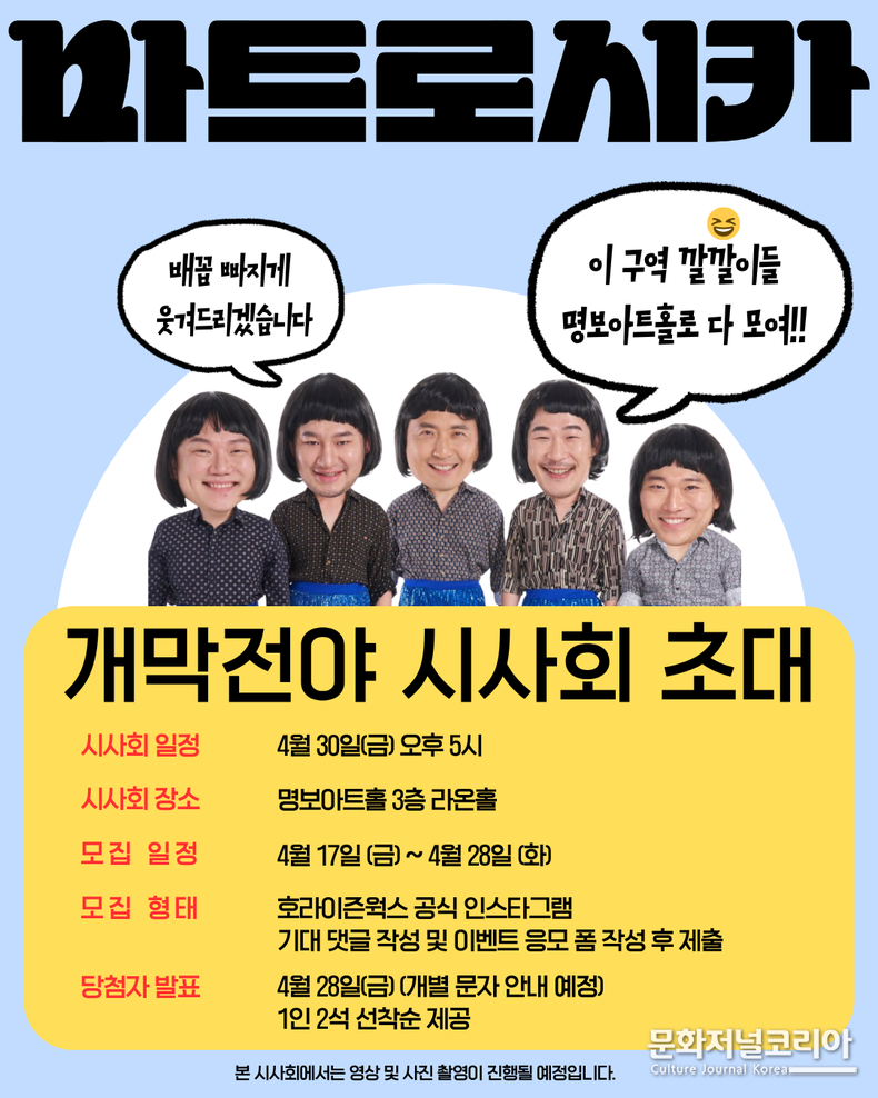 문화저널코리아 김영일 기자 | '전석 매진' 신화를 이끌며 대학로 코미디의 바이블로 굳건히 자리매김한 연극 '마트로시카'가 오는 5월 1일 새로운 시즌 개막을 하루 앞두고, 관객들에게 새로워진 무대를 가장 먼저 선보이는 특별한 '전야제 프리뷰 이벤트'를 4월 30일에 전격 개최한다.