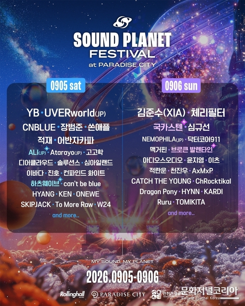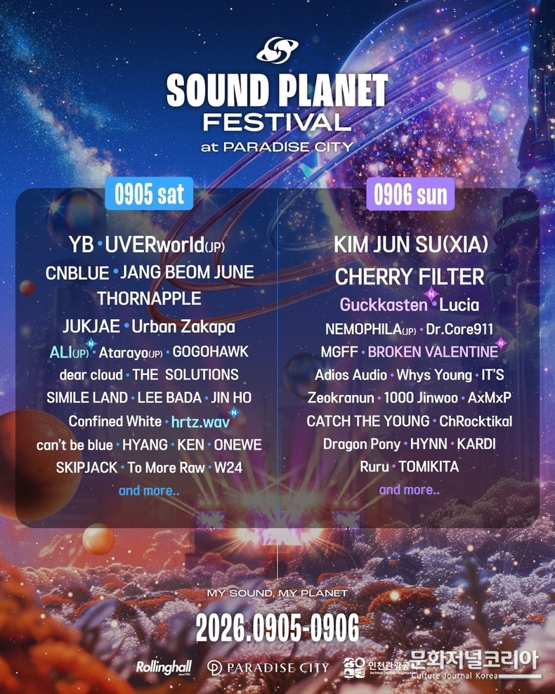 한편 홍대 라이브씬의 상징인 ‘롤링홀’이 주최하는 ‘사운드플래닛페스티벌 2026’은 오는 9월 5일부터 6일까지 파라다이스시티에서 개최된다. 총 5개 스테이지, 70여 팀이 넘게 참여하는 국내 최고의 초대형 페스티벌이다. 이어 2차 플래닛 크루 티켓(얼리버드 티켓)은 4월 17일 정오 멜론티켓을 통해 오픈되며 페스티벌 관련 자세한 정보는 공식 홈페이지 및 SNS 채널을 통해 확인할 수 있다.