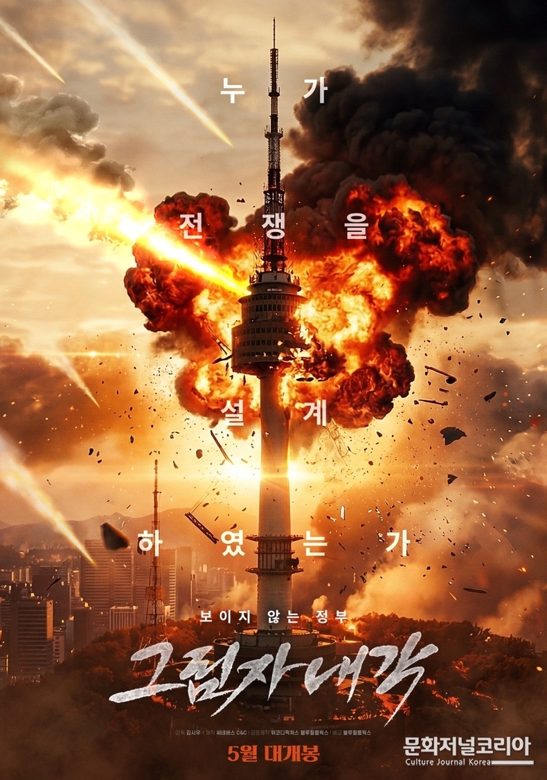 메인 포스터에는 서울 남산타워가 거대한 폭발에 휩싸인 강렬한 장면이 시선을 사로잡는다. ‘누가 전쟁을 설계하였는가’라는 문구는 역사와 현대를 관통하는 정치적 갈등과 내전을 암시하며, 관객으로 하여금 질문과 반성을 던진다. 이 폭발하는 서울 남산타워는 상징적으로 혼돈 속 권력의 붕괴와 그 배경에 숨겨진 그림자 내각의 실체를 표현한다.