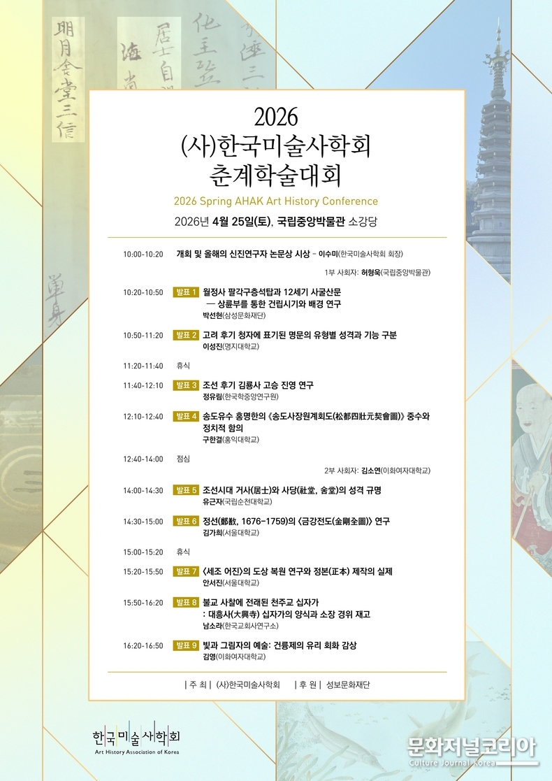 문화저널코리아 오형석 기자 |(사)한국미술사학회(회장 이수미)는 오는 2026년 4월 25일(토) 오전 10시부터 서울 국립중앙박물관 소강당에서 '2026년 춘계학술대회'를 개최한다.