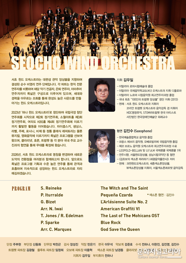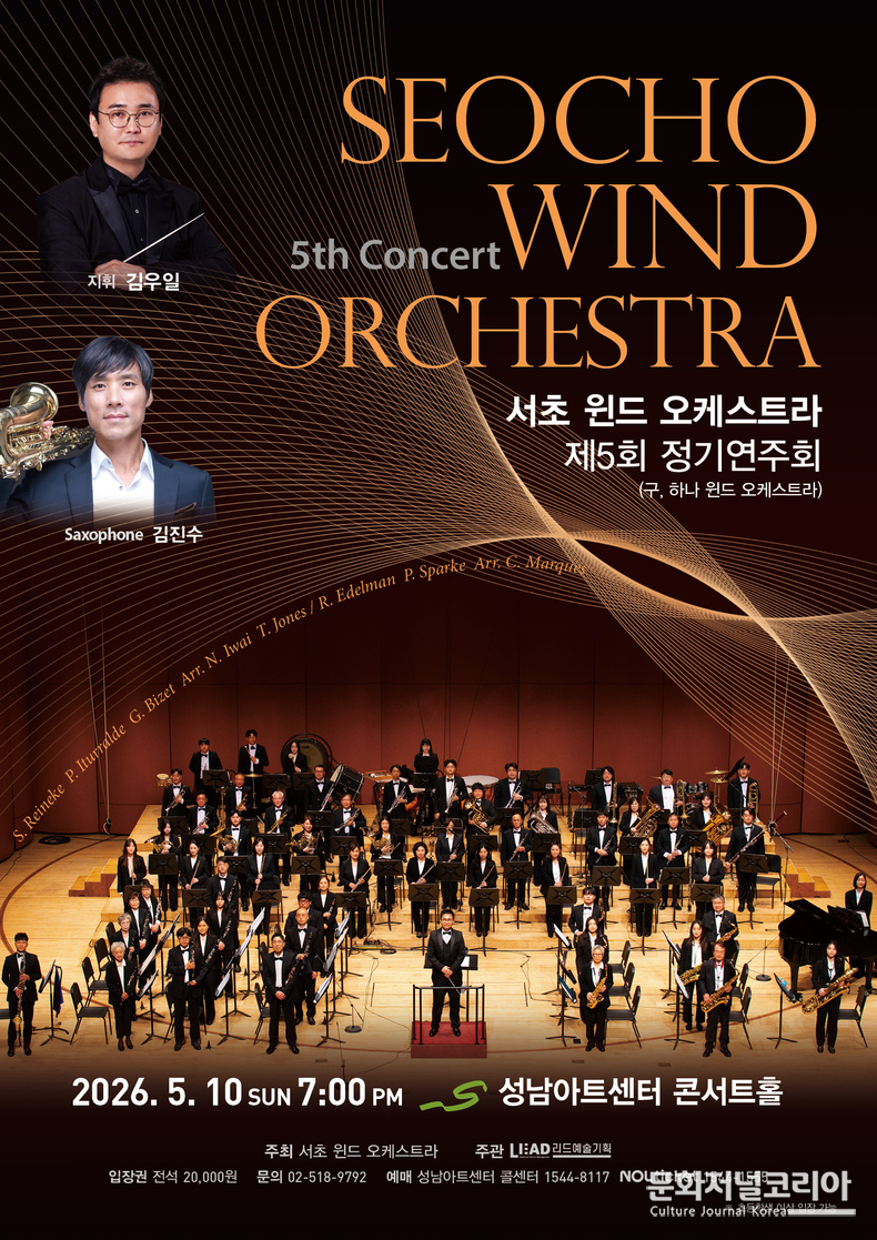 지휘는 서초 윈드 오케스트라의 음악적 방향을 이끌어온 김우일이 맡으며, 협연자로는 국내외에서 다채로운 활동을 선보이고 있는 색소포니스트 김진수가 무대에 오른다. 단체 측은 “명칭 변경 이후 첫 정기연주회로, 기존 활동의 연속성과 함께 보다 확장된 프로그램 구성을 통해 단체의 새로운 방향을 제시하는 계기가 될 것”이라고 밝혔다.