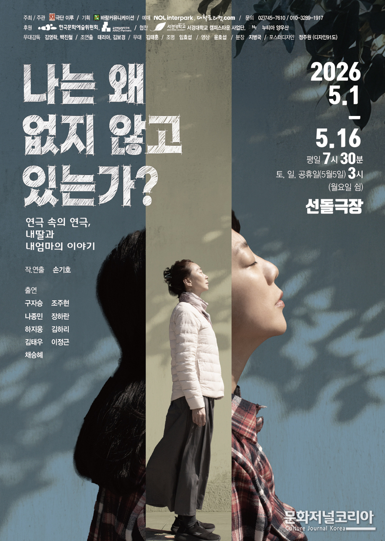 문화저널코리아 김영일 기자 | 2023년 낭독공연, 2024년 초연을 시작으로 평단과 관객의 호평을 받은 연극 ‘나는 왜 없지 않고 있는가?‘가 문화예술진흥기금으로 추진되는 한국문화예술위원회 공연예술 창작주체 지원사업에 선정되어 오는 5월의 문을 여는 첫날 1일부터 16일까지 대학로 선돌극장에서 다시 숙고의 과정과 전작 보다 높은 완성도로 무대에 올린다.