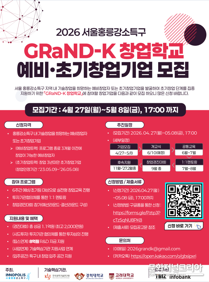 문화저널코리아 김영일 기자 | 서울 홍릉 일대 기술창업 거점인 홍릉강소특구사업단(단장 : 임환)이 티비즈, 인포뱅크와 함께 ‘2026년 GRaND-K 창업학교’ 참여기업 60개 팀을 오는 5월 8일까지 모집한다고 밝혔다.
