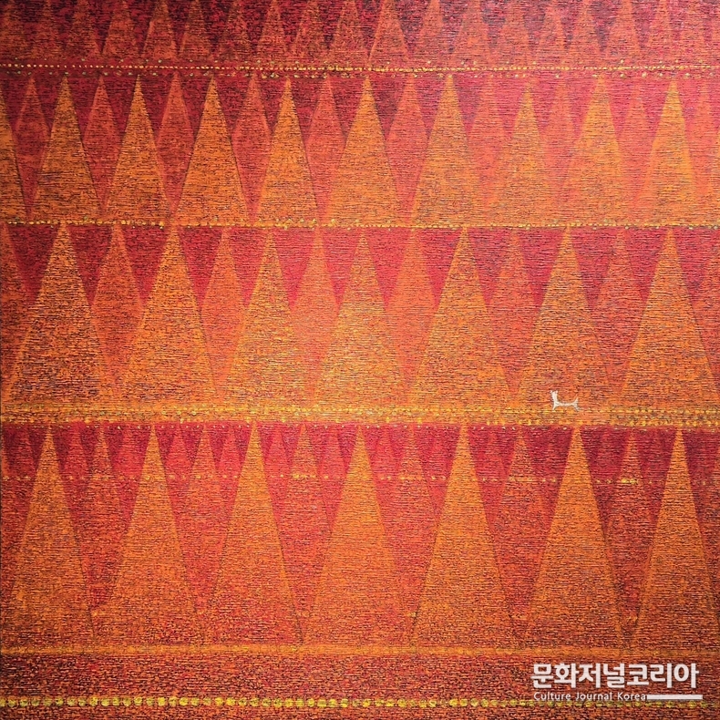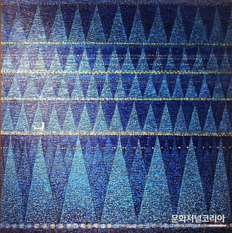 푸른 계열의 화면은 감각을 내면으로 수렴시키고, 수천 가지의 붓질이 미세한 진동으로 흩어져 삼각형의 반복 구조를 만들어낸다. 이 구조는 질서와 긴장의 이중적 체계를 구축하는 하나의 조형 리듬이자, 관람자의 심리를 압박하는 구조적 장치로 기능하다. 그러나 이 폐쇄적 공간을 가로지르는 황금빛의 꼬리-like 선은 존재론적 긴장을 전환시키는 결정적 지점으로 작용한다.