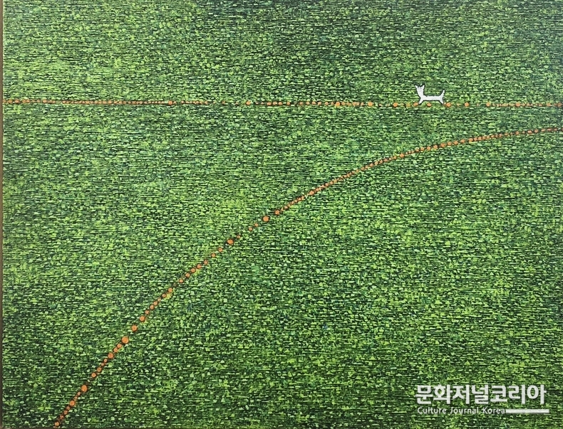 산양은 과장된 몸짓으로 저항하지 않으며, 오히려 위치를 이탈하지 않고 다음의 움직임을 준비한다. 이 반복은 상징을 넘어 하나의 태도로 읽히며, 정미애의 회화가 아름다움으로 환원되지 않음을 보여준다. 그것은 진실의 문제에 다가서는 두꺼운 시간과 감각의 총체적 기록이다.