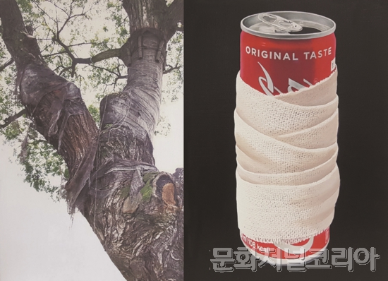 이은정의 또 다른 작품들 ‘그대를 품다 18P1~그대를 품다 18P12’에서는 산업사회의 상징적 물건과 자연 생명체들의 모습이 보여 지는데 다수의 자연체들에게는 붕대가 감겨있다.